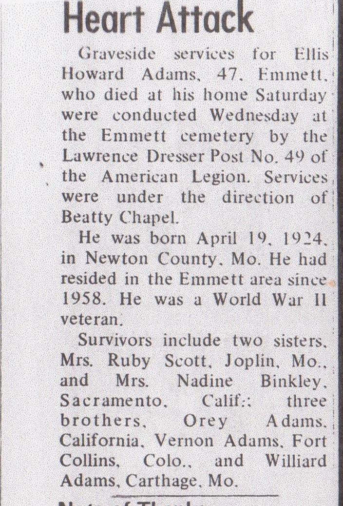 I mentioned a while ago that I’d emailed both the local newspaper in Idaho and the Idaho State Archives requesting any information on Ellis Adams. I had a quick response from the newspaper, who sent the following copy of Ellis’ obituary.