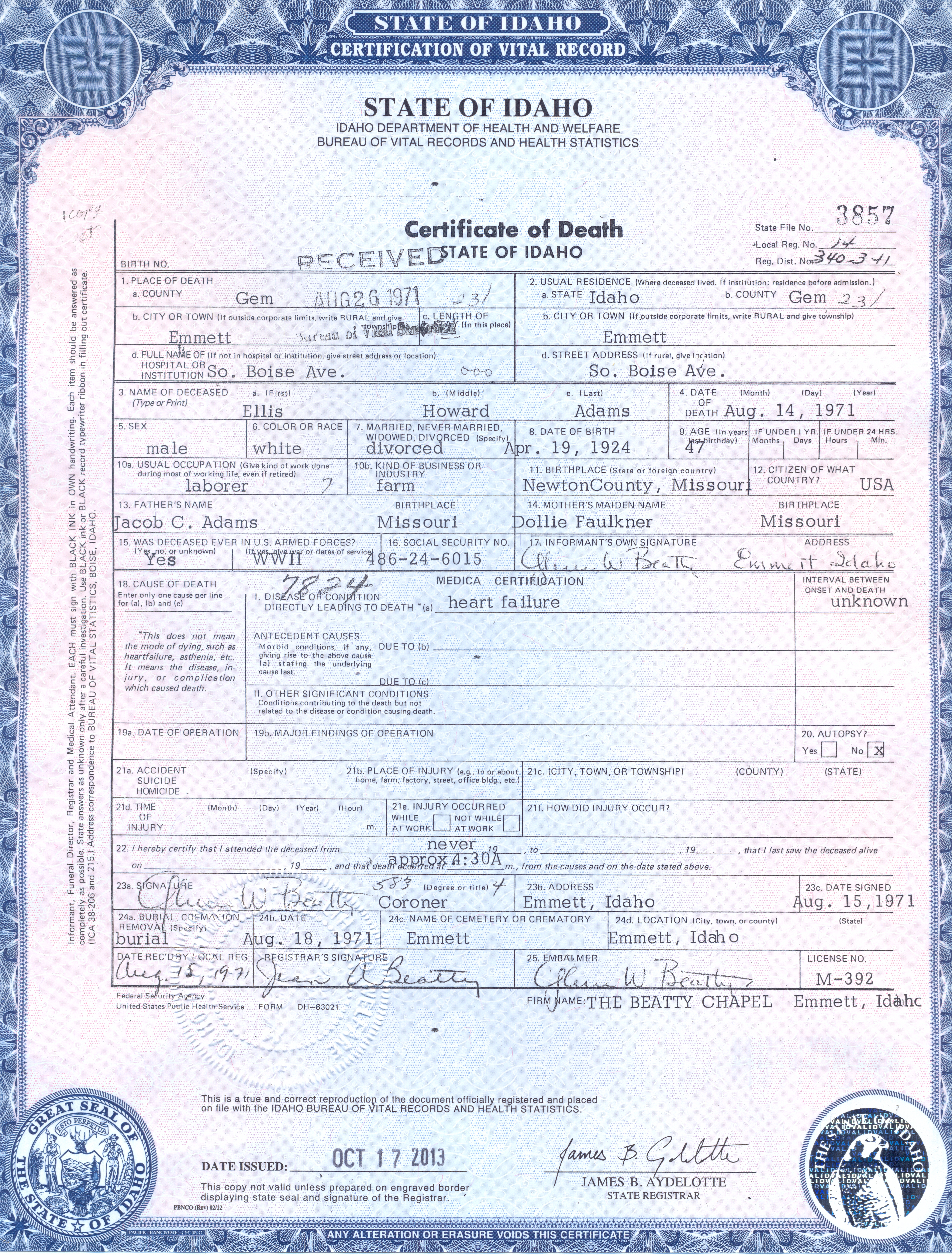 Perhaps once I receive a copy of the death certificate it may lead to some new information regarding a new family in Idaho. In the meantime I have contacted the Idaho State Archives and the offices of the local newspaper, the Emmett Messenger-Index, to see if they hold an obituary for him (assuming that he died in the same town that he was buried). So I guess its another waiting game to see what the Gem State (or Potato State, depending on what you prefer) holds!
