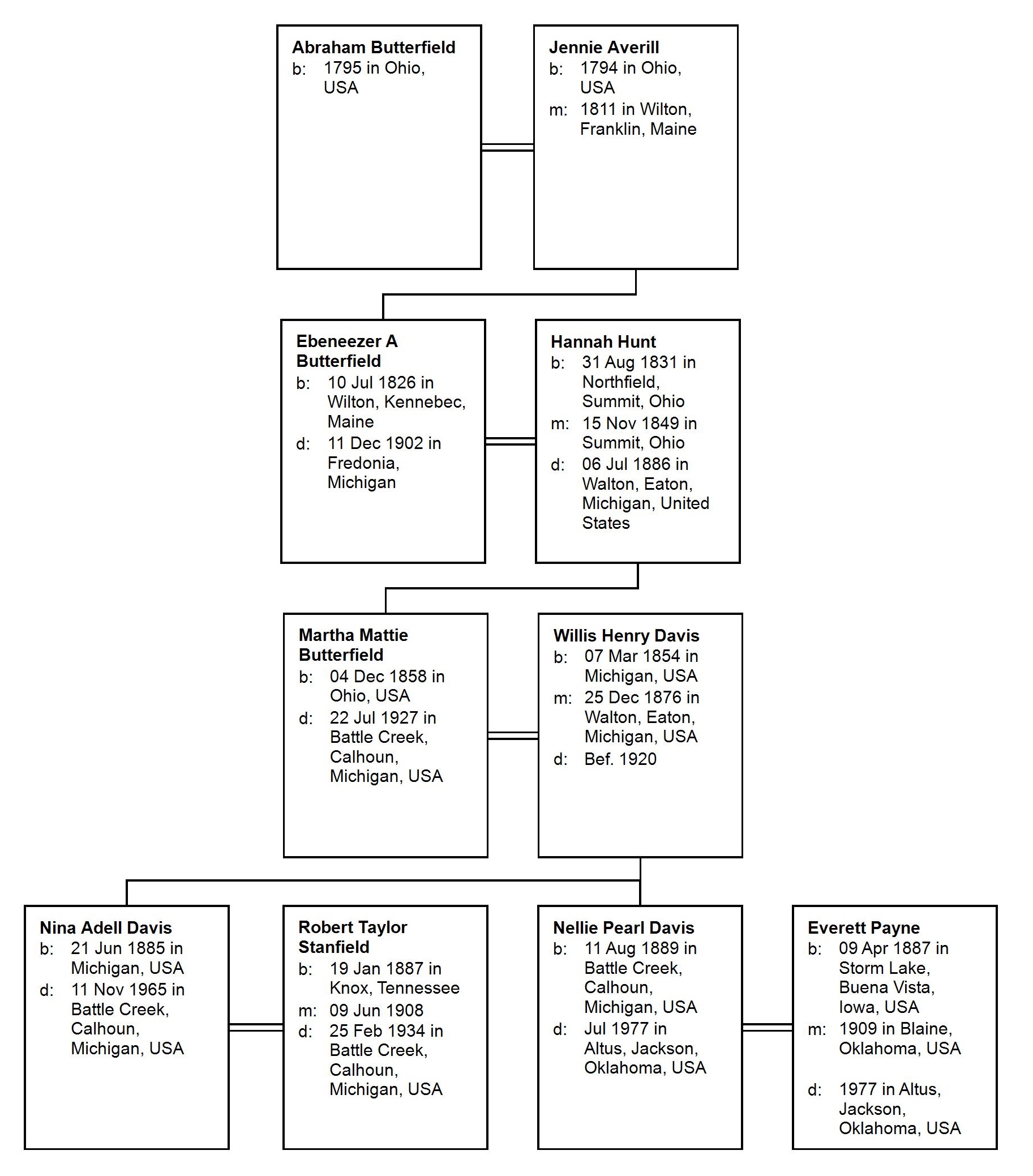The trail started in Michigan, with the mother and adoptive mother of my paternal grandfather, Robert Leslie Payne. Nellie Pearl and her sister Nina Adell Davis were two of the 7 children born to Willis Henry Davis and Martha Butterfield. Martha was the granddaughter of Abraham Butterfield and Jennie (or Jemima) Averill of Ohio.