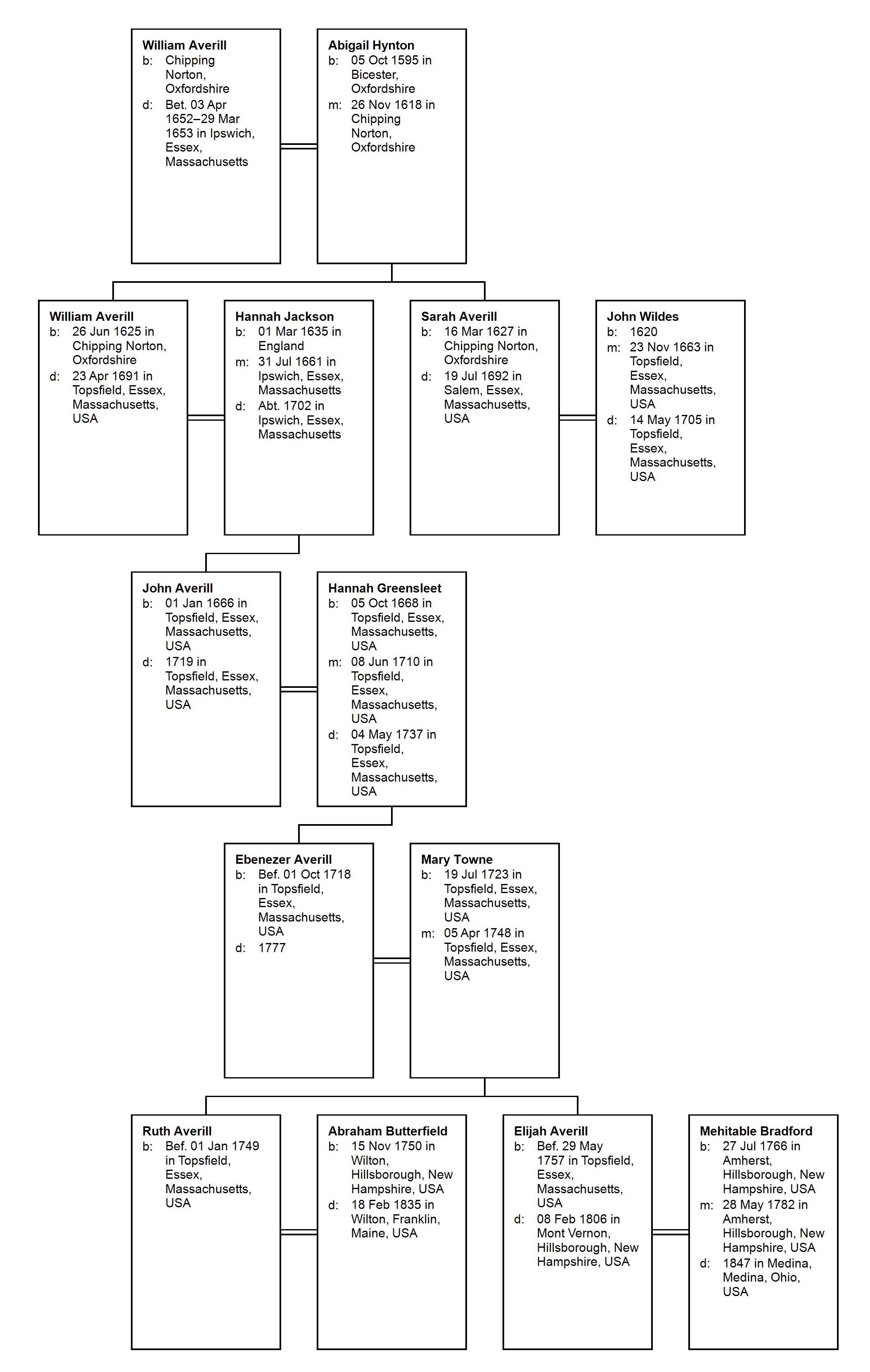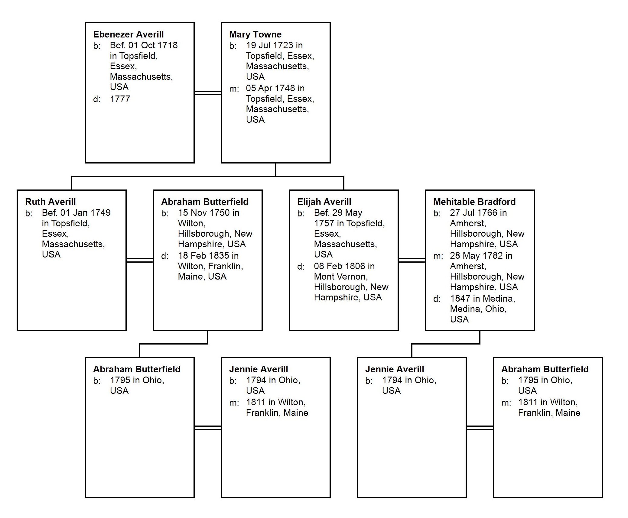 Abraham and his wife were cousins – both descended from Ebenezer Averill and Mary Towne of Topsfield, Essex, Massachusetts.