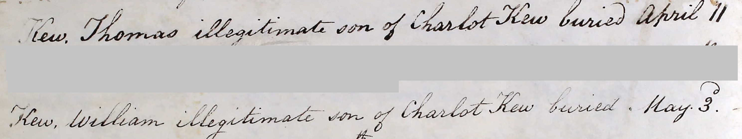 As can be seen, not only had the spelling changed from Cugh to Kew (along with a change in curate), but the legitimacy of the children wouldn’t escape the boys even in death.