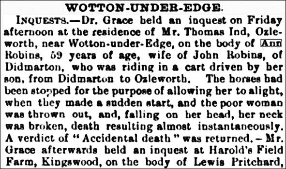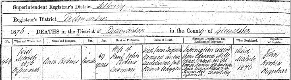 But then underneath the Signature, Description and Residence of Informant section was something that made me very pleased: Information received from Edward Wills Grace, Coroner for the lower division of Gloucestershire. Inquest held 3 of March 1876 Thornbury Ozleworth.