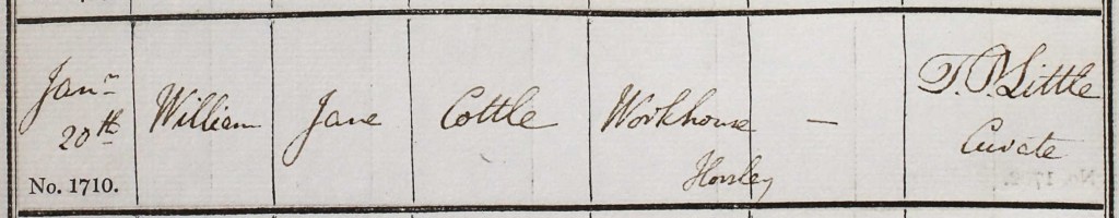 But that wasn’t all. On 20 January 1848, again in Stroud St Lawrence, Jane – still resident in the workhouse – a William Cottle was baptised.