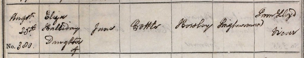 On 25 August 1844, Eliza was rebaptised in Horsley, only this time with an additional middle name: Halliday.