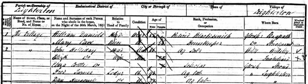 The 1851 census of Leighterton includes the Halliday parents – John and Elizabeth – living with an Eliza Cottle Halliday. The relationship column for her is blank. (Interestingly, one of the two lodgers is a Dan Hurcomb – actually David Hurcombe – a stepson of John and Elizabeth.)