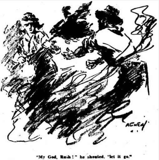 ‘She became conscious suddenly of a shattering sound smashing across the tumbled texture of her thoughts. Someone shouting out of doors, the rush of heavy feet across the yard towards the back door—then the clatter of some one inside the house, crying for her. She caught one word in Carpan’s voice, and instantly she was up and out of the room, the things she had held on her lap falling in an unheeded heap on the dusty floor. “Fire!” Carpan was standing in the kitchen, his rotund face excited, but not afraid. He spoke again as he saw her. “There’s a fire working up from behind the mountain, Ruth. We’d better see what we can do.”