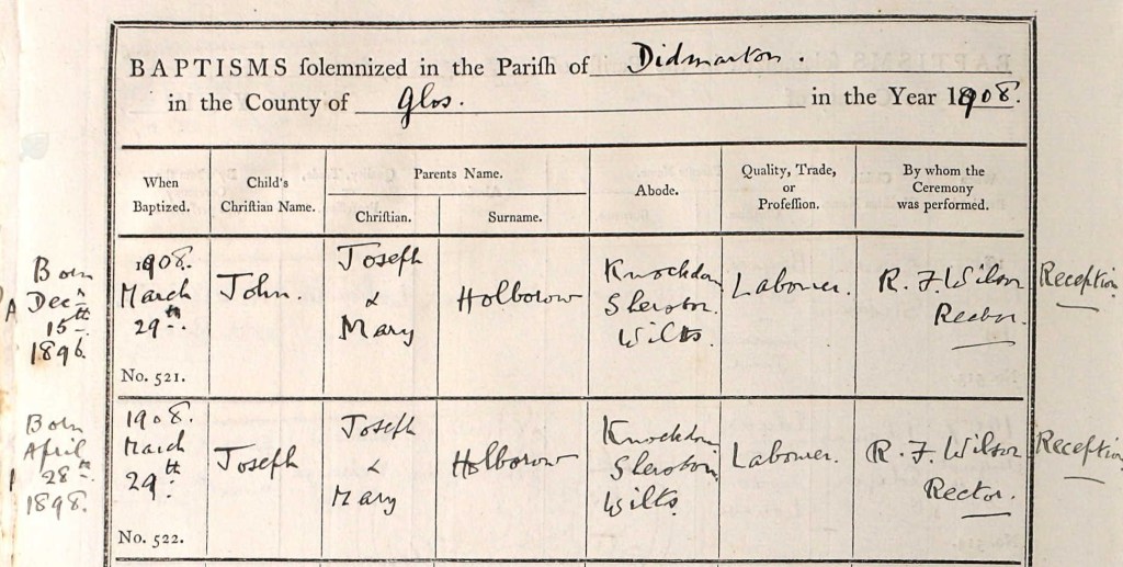 We’ll start with Joseph Holborow, born on 28 April 1898 in Knockdown, within the parish of Sherston Magna, Wiltshire. He was the youngest child (all boys) of Joseph and Mary (nee Teagle) Holborow.