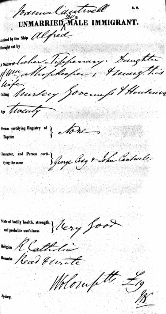 What else do we know of Jo(h)anna? She arrived age 20 on 19 January 1841 aboard the Alfred as an assisted passenger, along with her elder sister Mary, and was originally from Cahir in Tipperary, Ireland. State of bodily health and probable usefulness? “Very good.” So that was a relief for all concerned! Also please note her parent’s names: William and Margaret.