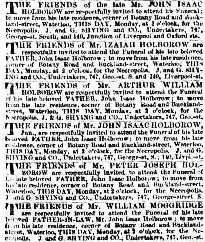 As I said, John and Johanna (sometimes Joanna, sometimes Johannah) had 8 children, including another John Isaac and an Isaiah. John senior manages to stay below the radar in terms of being mentioned in the newspaper. In 1844 his name appears in the Sydney Morning Herald stating that his partnership with William Lynch is to be dissolved, but he will continue in the butchery business. He appears again in an article from 1859 from the New South Wales Government Gazette as a named supporter of a petition for Waterloo to become its own municipality and separate from the municipality of Redfern. He is also listed as an “Inspector of Nuisances” (not as exciting as it sounds – part of the job was removing, uh, nightsoil).