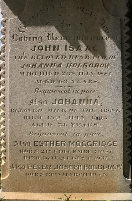 But where did John come from? If we return to his death certificate there are some pointers. His age at death is given as 65 which gives us a birth year of around 1815-6, and in “England”. (Although his headstone – see photo below – states he was 63, placing the range of a possible birth at 1815-1819!) The informant also declares that he had been in New South Wales for 40 years, meaning an arrival date of around 1840-1. It might be worth pointing out here that the informant is a son of John’s, and it appears to be ‘S. Holborow’. However, there is no evidence that John and Joanna had any children whose name starts with an S. Despite the fact that the letter matches another capital S on the form, I personally propose that it is supposed to be an I, and that the informant is either Isaiah or (John) Isaac (junior).
