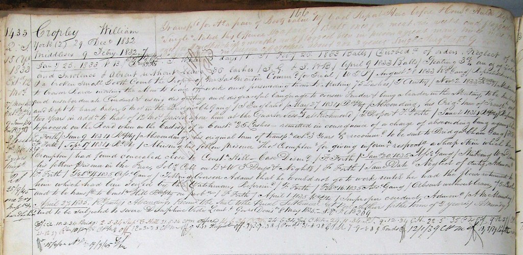 Maybe this emboldened young William. Or maybe entrenched in poverty from every side. But the name William Cropley appears in court records in 1825, 1826 and twice in 1827. The last time he appears is in 1832 charged with stealing one pair of boots, worth 10 shillings. He was found guilty and charged with 7 years transportation to Van Diemen’s Land (Tasmania), arriving in Hobart aboard the York on 29 December 1832, aged 20.
