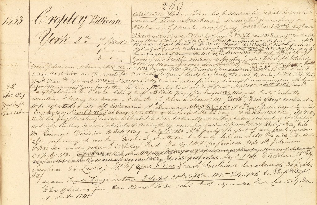 William … didn’t take to convict life. Whilst Samuel’s conduct report was a handful of lines long, William had to have two separate entries within five years (bearing in mind his term was only seven years) – and within four months of arrival his sentence had been extended by 12 months. It would later be extended again by another five years.
