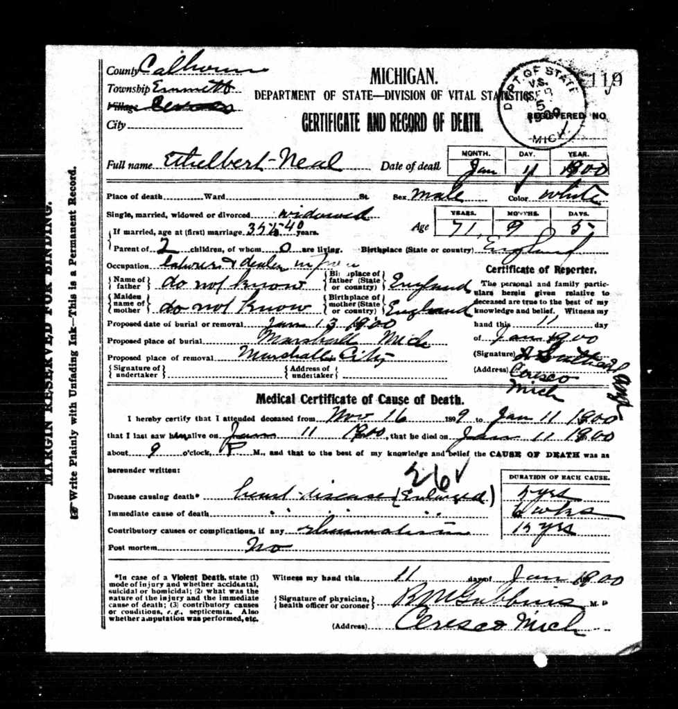 What amused me most (not the abandoning of his family part) was the fact that in 1860 he was living in Emmett Charter Township in Michigan – which is the absolute neighbour of Battle Creek where my paternal grandfather’s family lived (and where I still have relatives!). He is listed as a Miller, living with his wife Elizabeth, a Catherine, Mary and Margaret Murphy and finally William Neal, aged one month. I can’t find an online marriage certificate for Ethelbert and Elizabeth, so I don’t know if Murphy was perhaps her maiden name (i.e. the girls are her younger sisters) or if she had previously been married (i.e the girls were her daughters). Although there is a teasing trail of Catherine marring in Marshall, Michigan which matches up with a death certificate giving her parents as Nicholas Murphy and Elizabeth Wood.