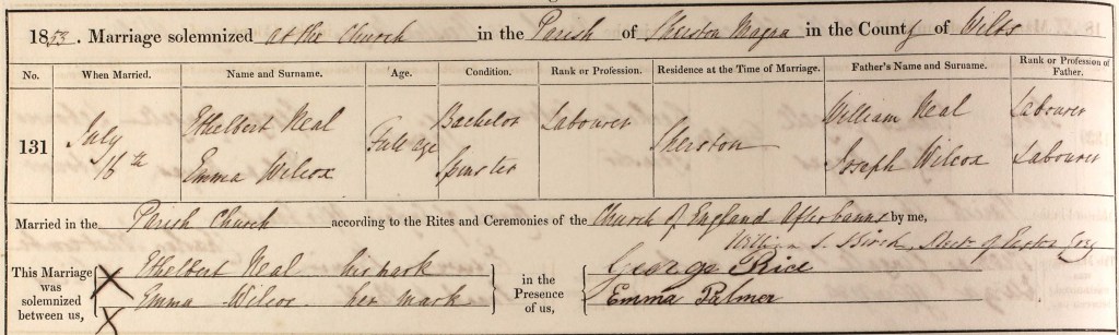 The 1841 census is a little more helpful. There is an Ethelbert born approximately 1827 living with what looks like a family group, all the children of a widowed William Palmer. He is probably the same Ethelbert who in the 1851 census is lodging with his brother Joseph Palmer Neal and his wife, and is also the one who then marries Emma Wilcox on 15 July 1853 as he lists his father as William Neal. Which is great. They have a son called – you guessed it – Ethelbert in August 1855 who sadly died the next day (they also previously had a daughter called Emma Matilda in 1853).