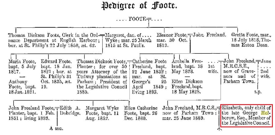 Then two other publications caught my eye. The first is ‘The History of the Island of Antigua’ by Vere Langford Oliver, published in three volumes between 1894 and 1899. Vere was a British surgeon and genealogist which possibly explains a lot. However, the first volume contains a couple of Holborow mentions. In a list of the 1885 Colonial Office List, George Holborow is mentioned as a member of the Executive Council (Local) as an Elected Member. Then in a pedigree of the Foote family, an Elizabeth Holborow is shown marrying John Freeland (whose grandmother was a Foote). He lists her as “only child of the late George Holborow, Esq., Member of the Legislative Council“. The likelihood of there being two George Holborows being members of the council, one with a daughter and one with a son, seems very slim to me, so either Vere or Agnes are mistaken in their assertions.