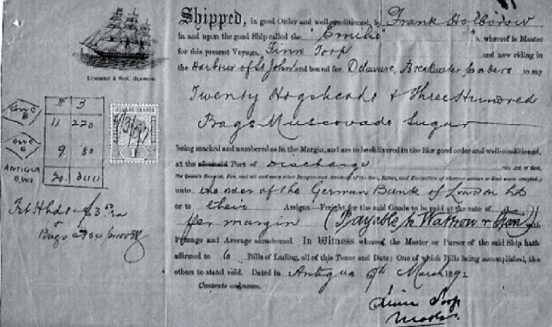 We have his name on a shipping order form from 1892, stating that the ship (the Emilie, captained by Finn Torp) held twenty hogsheads and 300 bags of muscovado sugar bound for England via Delaware.