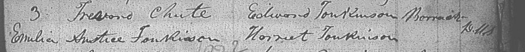 Firstly, the below baptism for “Emilia” found in the National Library of Ireland’s archives for baptisms in the Diocese of Cloyne, Youghal, County Kerry. Dated to 3 July 1849, Emilia’s parents are Trevor Chute and “Anstice” Tonkinson, and her godparents/sponsors are Edward and Harriet Tonkinson.