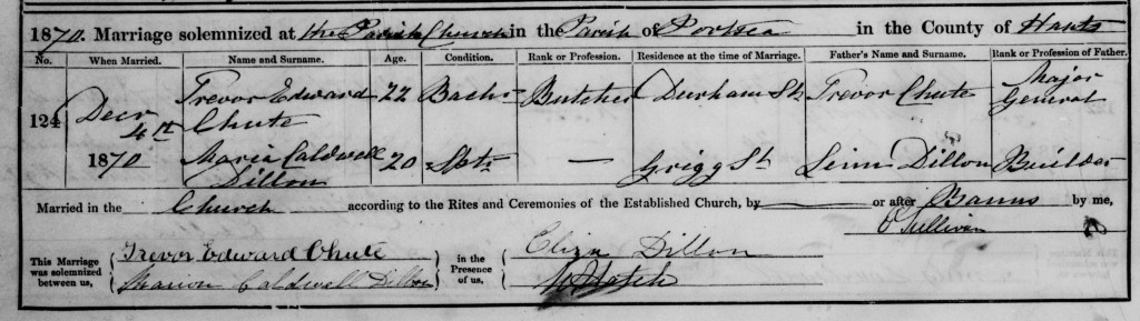 Amelia goes on to marry twice. The first time in St Peter’s Catholic Chapel, Winchester in 1872, and the second time in London, in September 1883. On her second marriage certificate, her father is listed as Edward Trevor Chute (deceased), military officer. I mean, its possible that there could be two of them, right?