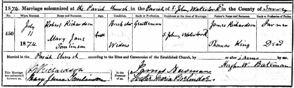 However, this was not to last and William died later that same year aged just 25. What is a poor widow to do? Find herself Husband No. 2, which she did under the name of Robert Richardson. He describes himself as a “gentleman” on his marriage certificate.