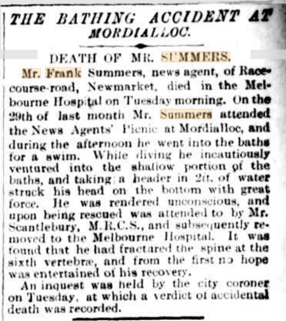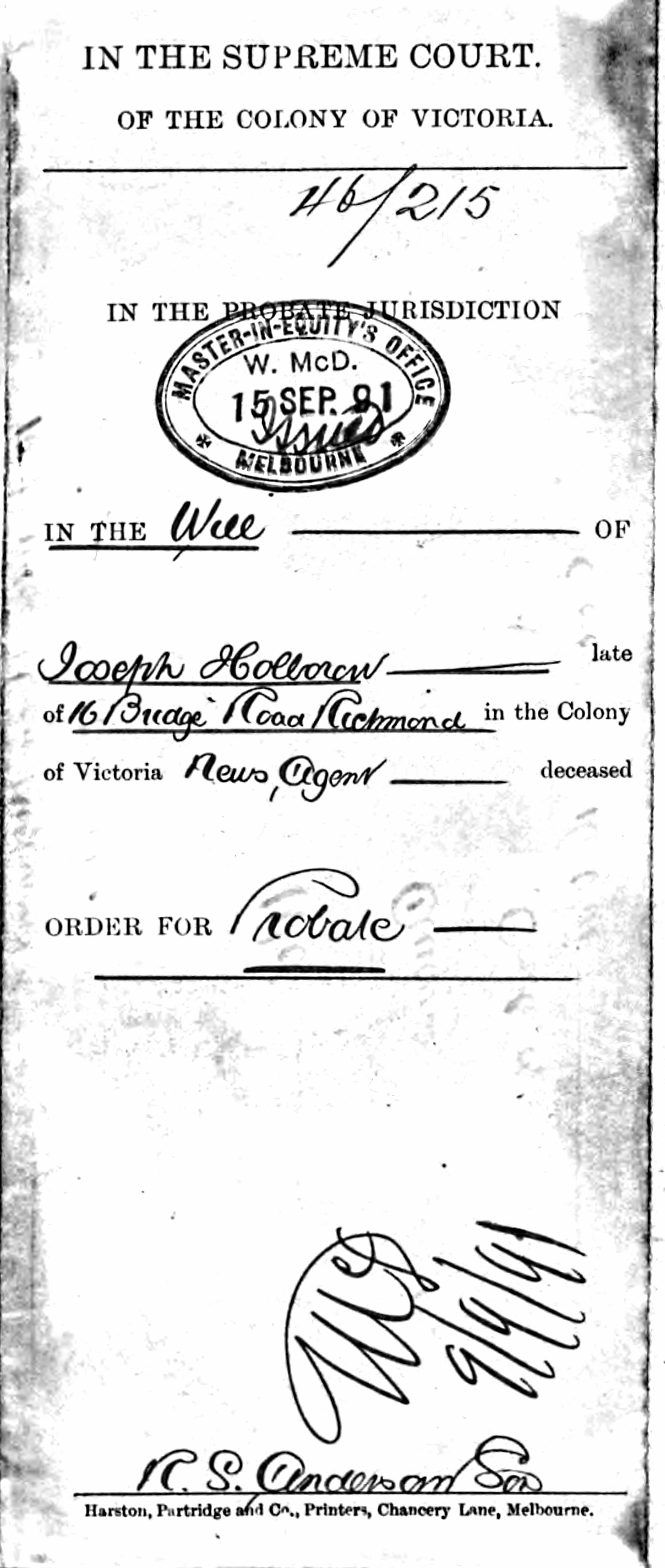 Joseph last appears in England in the 1851 census, but only first appears in Australia in the Victoria State City Directories in 1869, implying an arrival no later than 1868, and is already listed as a News Agent, residing at 56, Bridge Road, Melbourne. Interestingly, Robert and Harriet’s son, Frank was also a news agent so I wonder if they worked together in some way. Joseph’s probate packet survives, and at the time of his death on 3 August 1891, Joseph had no real estate, but personal estate of £800. His nephew Robert William Summers, bank manager, was one of his executors.