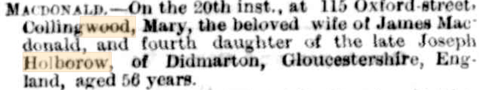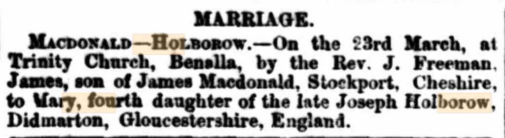 The 4th member of the family likely arrived before – or perhaps with – Joseph. Or perhaps she travelled with Harriet. But on 23 March 1864, Mary Holborow married James MacDonald: