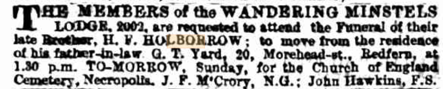 I did not expect to be looking at Wandering Minstrels in my research! However, I believe that this was a ‘special’ lodge of the Manchester Unity of Odd-fellows. A kind of fraternal and benevolent ‘Friendly Society’ rather than a secret society, members would come from all different trades (as opposed to the guild system, hence being called “odd fellows”) and pay dues which would then tide over members in times of unemployment, and often supplied medical treatment for wives and children of members, as well as being able to avoid the shame of a paupers funeral. Wandering Minstrel seems to have been a unique lodge, formed by a number of actors, often on the road and not available to attend all meetings of a lodge. Was Henry Francis an actor or musician? The Manchester Unity Independent Order of Oddfellows in NSW was established in 1840 and still exists today, 180 years later.
