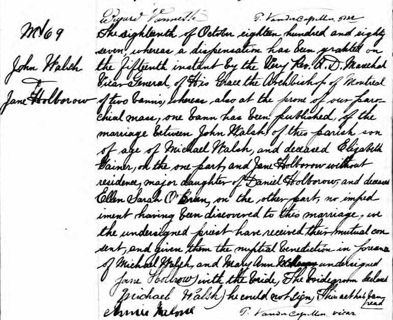 Three years later, she has travelled over 1200km west to Montreal where she marries John Walsh on 18 October 1887. Interestingly, she is listed as “without residence” and also names her mother as Ellen Sarah O’Brian, deceased.
