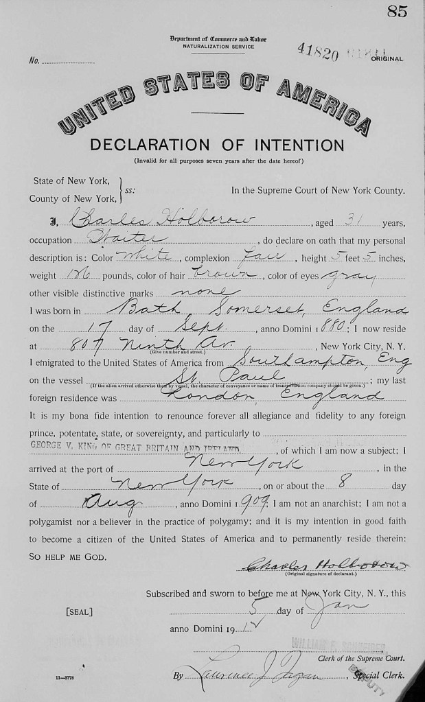 On board was one Charles Pride Holborow, a 28 year old waiter from London. Strangely, he gives his next of kin details as Sarah Holborow, with an address of Maida Vale, London. He arrived in New York on 8 August 1909 and by the time of the 1910 census, has found employment as a butler for an independent lady in Princeton, New Jersey named Katherine Euphemia Turnbull, the great-granddaughter of Governor William Paterson of New Jersey. He was also as Associate Justice of the Supreme Court and one of the signatories of the United States Constitution. So absolutely no big deal that Charles managed to enter her household as a butler almost straight off the boat. Christmas Eve 1911 saw him marry fellow Brit abroad, Annie Flaherty in Manhattan. January 1912 he purports to be living at 807 9th Avenue, New York as this is when he is naturalised. (Currently, according to Google Maps, this is a restaurant called Westville). The pair disappear from view for a short time, but reappear in time for the 1925 New York Census where they are living on West 54th Street in New York, which stretches from 12th Avenue east to 5th Avenue (and possibly just around the corner from his address in 1912).