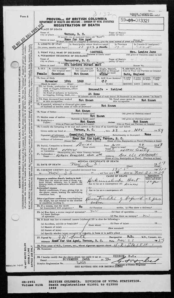 At some point she made it to an old-age facility in Vernon, and it was here that she died and was buried in Vernon in November 1959. John had predeceased her.