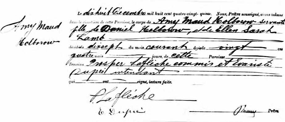 Sadly, on 18 December 1892 Amy Maud Holborow, aged 20 years and four months, was buried at Notre-Dame Basilica in Montreal. Her burial registration mentions her parents, Daniel and Ellen Sarah nee Lamb, and that she was a servant.