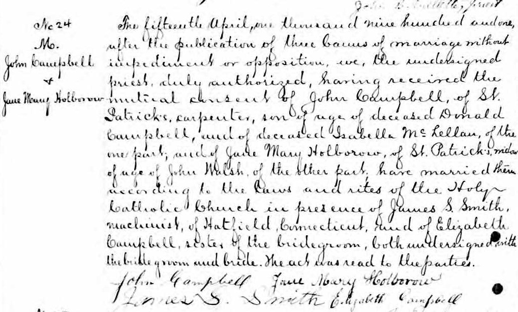 John died 9 April 1899 in Montreal. A few years later a Jane Mary Holborow, widow of John Walsh, marries John Campbell, a carpenter, at St Patricks, Montreal.