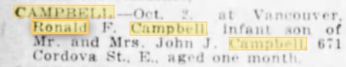 At some point, the Campbells moved to Cordova Street in Vancouver. Louisa and John went on to have five children altogether, although one son, Ronald Francis Campbell, had a short life: