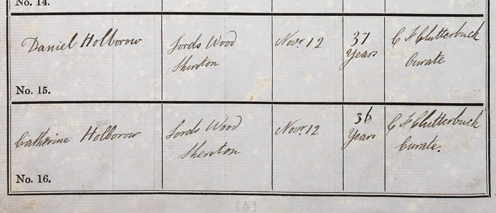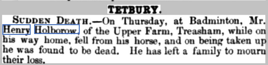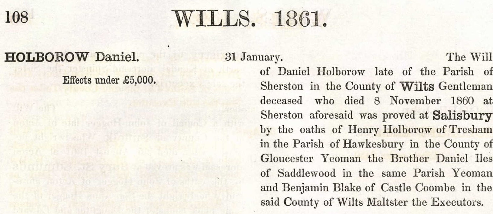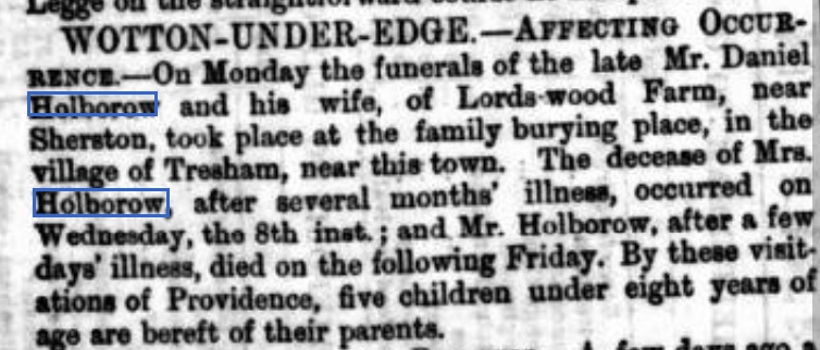 The article tells us a few things of interest. One being that Daniel and his (unnamed) wife were living at Lordswood Farm near Sherston, Wiltshire, but were buried in Tresham (in Gloucestershire, about 8 miles to the north-west). The burials took place on the Monday prior, so 11 November, with Mrs Holborow dying on Wednesday 8 November after a long illness, and Daniel dying on the Friday. I have consulted a calendar and apparently 8 November in 1860 was a Thursday, and the Friday was then 9 November (ie the next day, not “a few days’ illness”). Not the only oddity. The burial register records the following: