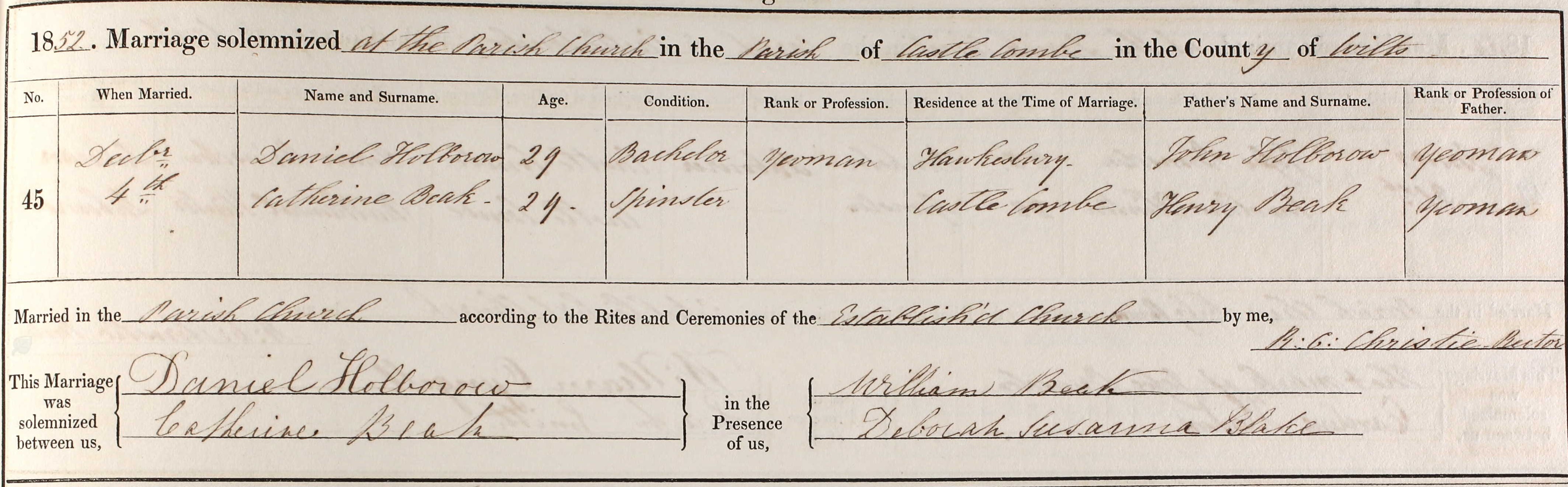 So, naturally, I wanted to know more about this pair and their orphaned children. The most likely marriage was a Daniel Holborow marrying Catherine Beak in late 1852 in the Wiltshire village of Castle Combe, near Chippenham (now mostly famous for its proximity to the famous racing circuit – the eponymous castle having been demolished before the reign of Henry IV).