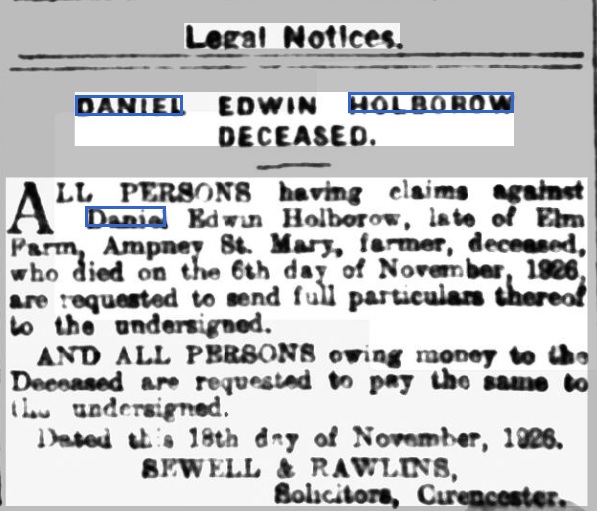 Daniel Edwin married his second cousin, Catherine Frances Beak (his mother, Catherine, was his wife’s father’s cousin). Daniel died in Ampney St Mary, close to Cirencester in 1926, aged 67.