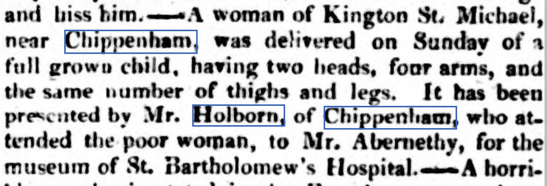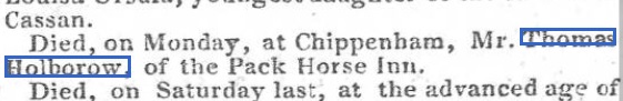 In this instance wills do not come to my rescue as there are no Holborn wills and limited Holbrow ones from the right period and time. My old friend, the British Newspaper Archive, also lets me down. Although there was one intriguing result for Holborn & Chippenham: