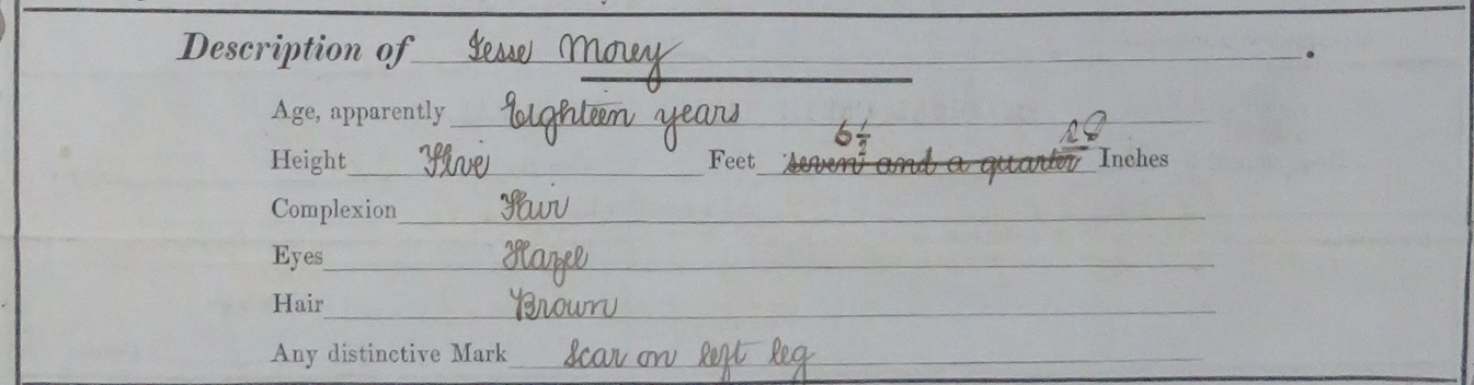 We see that he is 5’6.5″ tall, of fair complexion, with hazel eyes and brown hair. He also has a scar on his left leg (a comment in the medial section states left knee).