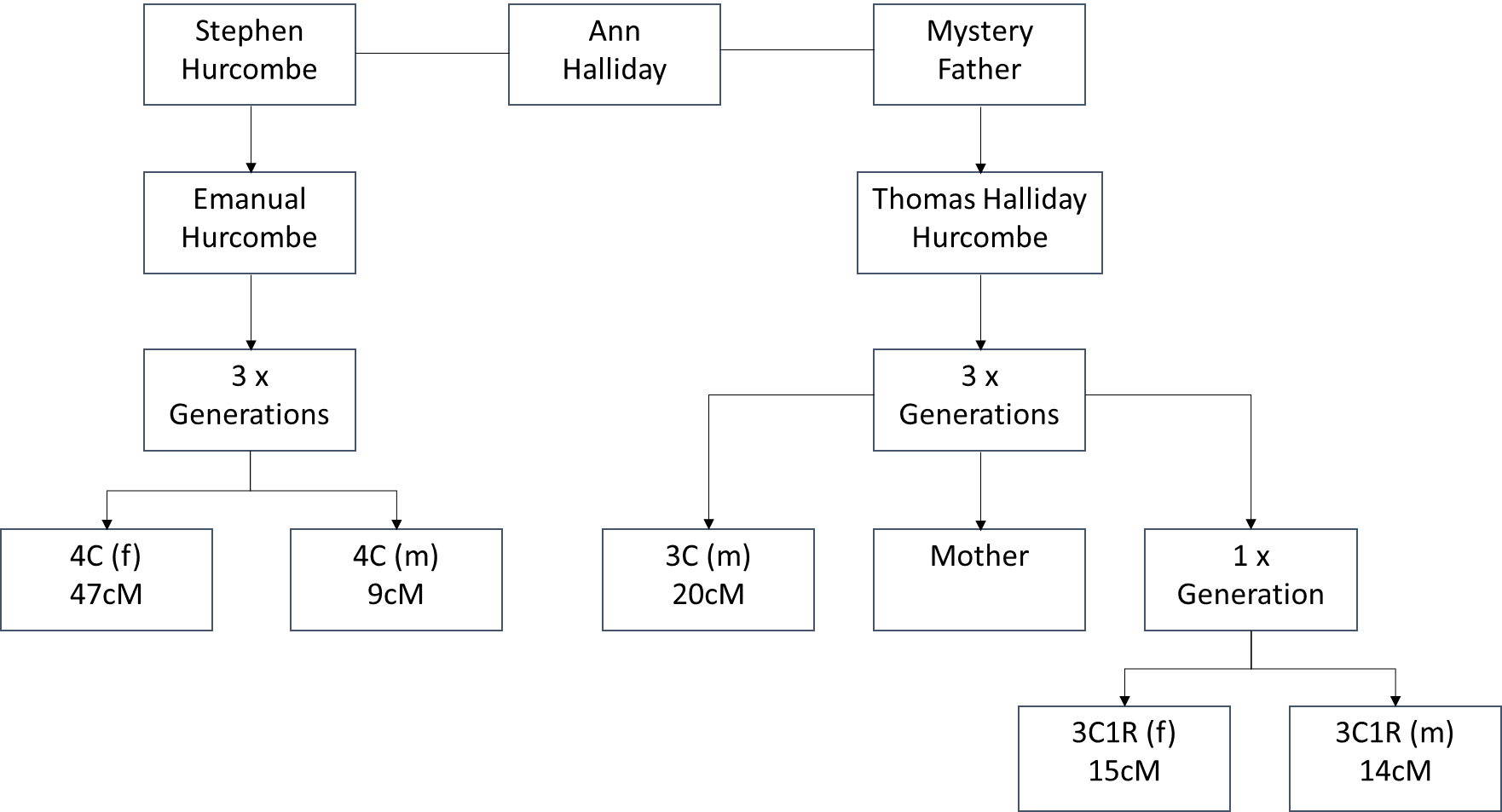 The father of my 3 x great-grandfather, Thomas Halliday Hurcombe, has been a question mark in my research almost since Day One. However, the potential identity has often been posited. It wasn’t until last night when discussing centiMorgans with a friend (consanguineous relationships!) that I realised that the means to test this hypothesis was not only within my grasp – but the answer was in my proverbial Inbox!