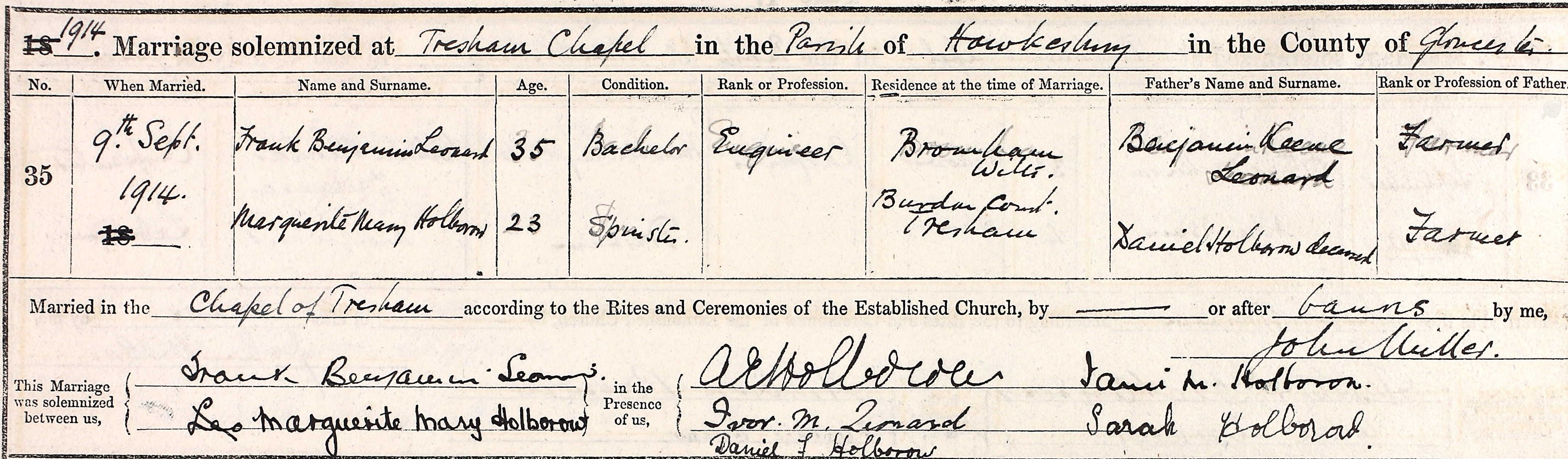 William’s elder sister, Marguerite Mary, was a viable option, as she was born in 1891. Of note was her marriage certificate of 1914. I had completely missed the place of residence of her husband, Frank Benjamin Leonard.