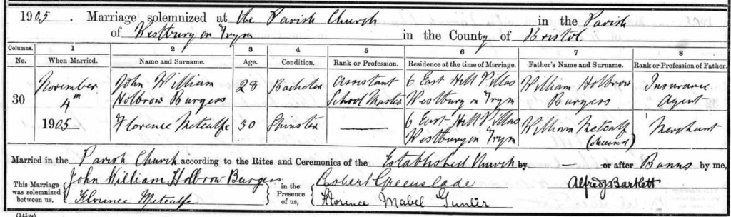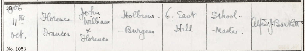 No hyphen, but Holbrow Burgess is present, in the right place and with the right occupation. John’s father is given as William Holbrow Burgess, an insurance agent. Perhaps the 1901 census would help. I knew from the 1939 Register that he was born in the September of 1877. However … No John William Holbrow-Burgess births. Ditto John William Burgess. Perhaps the Burgess came later and he was born a Holb(o)row…?