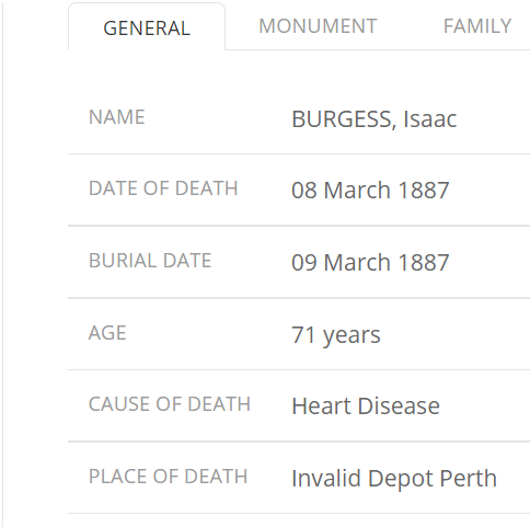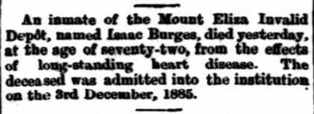 Isaac enjoyed another 20 years of freedom before dying in March 1887. I can’t find a published obituary of his death, but the convict records have him dying in “Mt Eliza”. Initially, that was confusing as Mount Eliza is in Victoria, not Western Australia, and he appears to have been buried in Perth. Mount Eliza is a hill that overlooks Perth. However, Mt Eliza (the contraction is important!) was also the site of a convict hiring depot (until 1872 when it was closed), an ‘invalid depot’ and a poorhouse for men remained on the site.