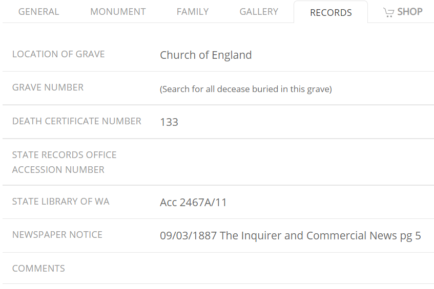 I have ordered his death certificate from Western Australia State Archives, and I await its arrival with impatience! Edit: The certificate arrived and … told me nothing more, just the date, cause of death, occupation (labourer) and age.