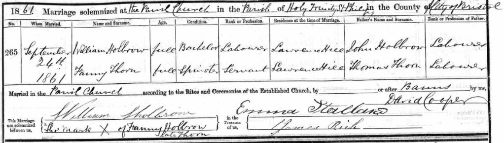 Of course, none of these include the name Burgess. Frances Thorn can be found living in Almondsbury a village and parish in South Gloucestershire) as a house servant in the 1861 census. Also in the village is one William Burgess, an agricultural labourer. Unfortunately, he has been recorded as having been born in Almondsbury, but otherwise I believe this to be our William and perhaps the head of the household gave the incorrect information to the enumerator.