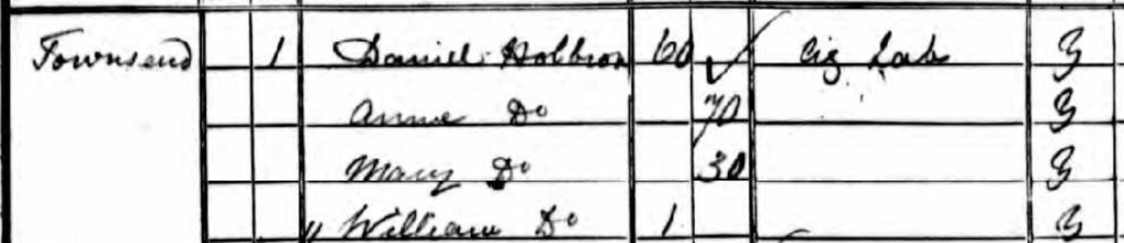 Well, here the entire household (William, Frances, John William and an elder daughter, Mary) are all enumerated as “H Burgess”. Presumably for Holbrow Burgess.