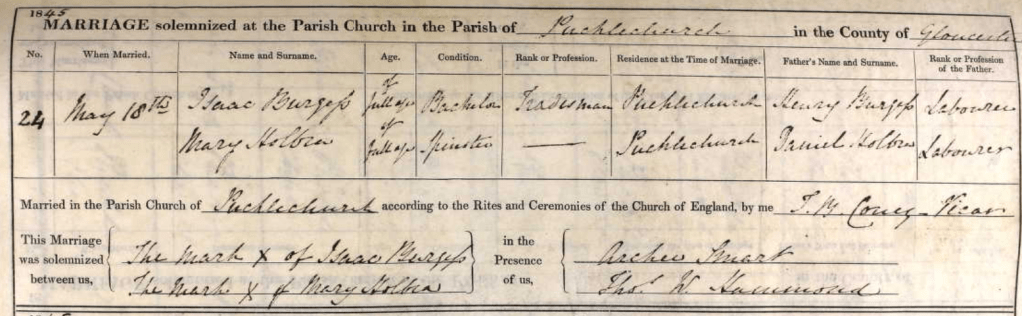And it’d be right and fair to ask that question. Luckington isn’t Chippenham, and do we take the father’s name on the marriage certificate to be gospel? Good points. However, I raise your good points and play my final card (I don’t know, I don’t play poker). Of the four marriages that take place in Pucklechurch, Gloucestershire, in 1845, the first one is the following: