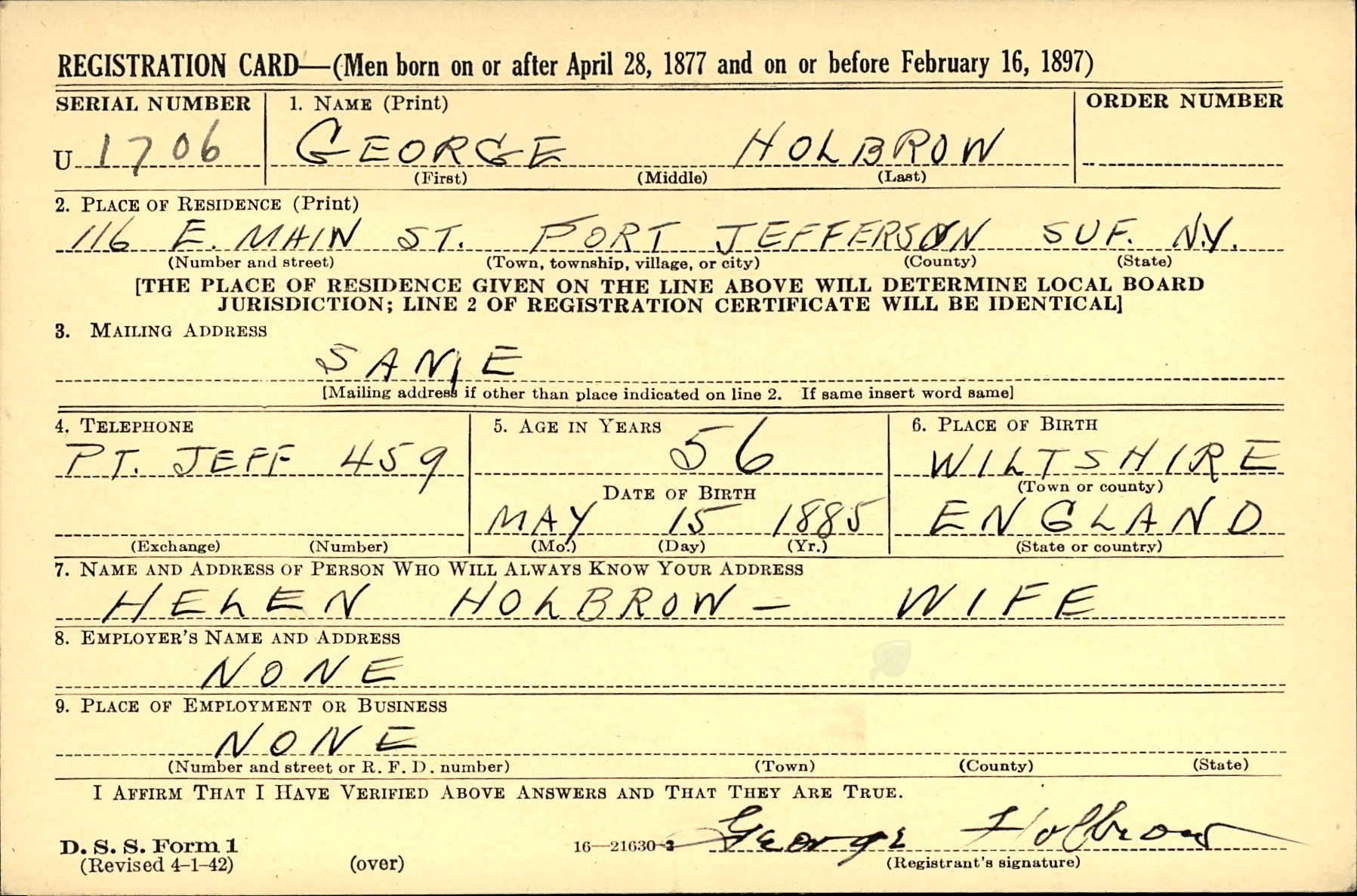 By 1950 they had moved to the North Shore of Long Island and the town of Port Jefferson. Although no occupation is recorded on the census, there are five “roomers”. Whilst today a move to Long Island may signal a family on their uppers, in the 1950s, Port Jeff (as it is known) was still recovering from the collapse of the local shipbuilding industry in 1923 with the closure of its main shipyard and remained in the economic doldrums until the mid-to-late 1960s. How much of that regeneration George got to see was limited as he died in 1961; Helen in 1966.
