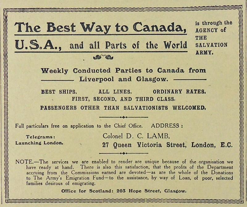 It is little remembered today, but during the first half of the twentieth century, the Salvation Army was the largest voluntary migration society in the UK – almost 250,000 people migrated across the “Dominion” with them. In 1914 alone, just short of 5,000 people used them, with 769 of them having their trips paid for by the Salvation Army. Ethel and George were two of them. One thing that differed was that the SA implemented a service where they supported migrants even before they left.