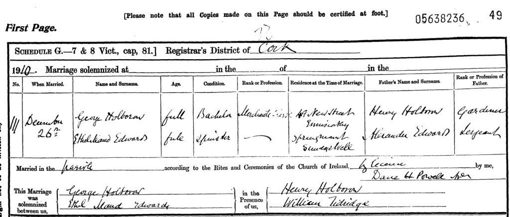 Henry’s son George had married Ethel Maud Edwards in Cork on Boxing Day 1910 with George listed as a Merchant’s Clerk. Presumably, this entailed some degree of travel as in 1911 George is 120 miles away in County Wexford in a boarding house. His occupation is “Commercial Clerk, Bacon Department”. Also in the same boarding house that night was an Edward Pounden with the same occupation. One assumes they worked together, otherwise, it’s quite a coincidence!