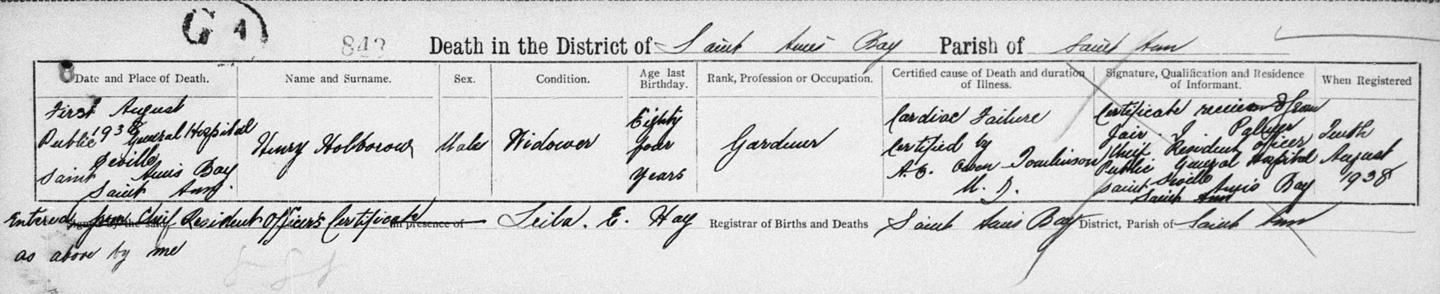 The death certificate of 84-year-old Henry Holborow, a widowed gardener. The surprising part? That it happened in a hospital in St Louis Bay, Saint Ann, Jamaica. Quite how a man who was last seen living in Cork in 1911 gets to Jamaica yet doesn’t appear on a Passenger List. Even if he left from Dublin (or Cork) the ship in all likelihood would have come from Liverpool (if he hadn’t traveled to Liverpool directly) so he should be on a UK Outward Passenger List.