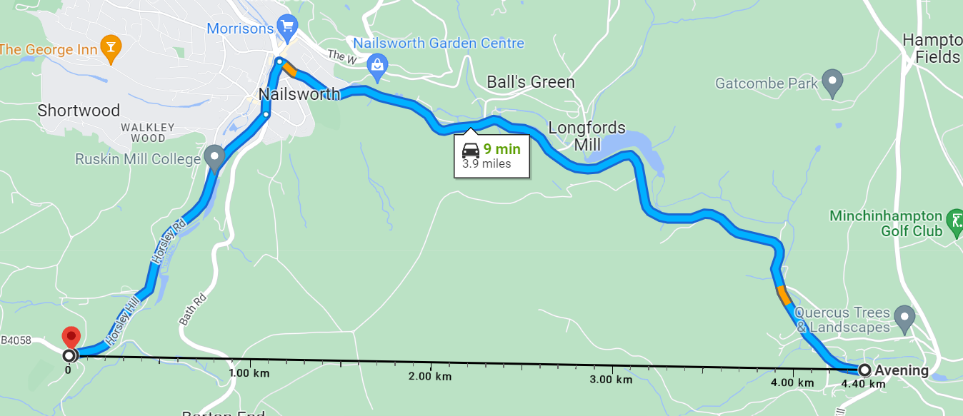 Avening is a parish located about 2.75 miles due east of Horsley – but due to local geography its about a 4 mile trip by road between them.